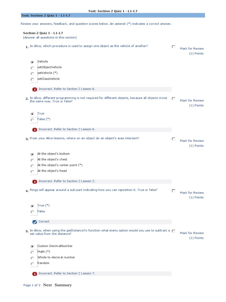 Mark for Review 1 Points True False Incorrect. Previous Page 2 of 3 Next Summary Test. Refer to Section 2 Lesson 5.