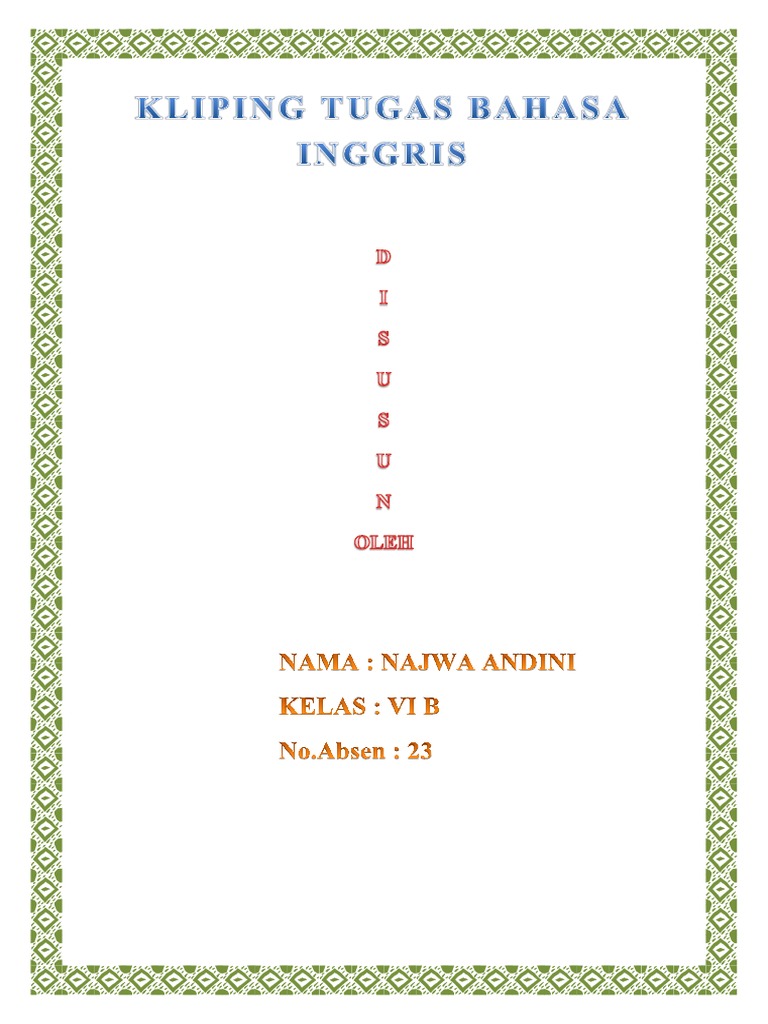 Tugas kliping bahasa inggris. Contoh sampul klipping bahasa inggris gambar animasiCONTOH KLIPING Hallo teman-teman semua siapa diantara kalian yang pernah mendapatkan tugas sekolah dari guru untuk membuat klipingPastinya teman-teman semua pernah dong yah yang namanya mendapatkan tugas dari guru yang di tugaskan untuk membuat kliping entah kliping bencana alam olahraga atau lain sebagainya. Berikut ini contoh kliping pilihan yang dapat memberikan inspirasi kepada anda dalam pembuatan kliping. Kliping masih saja dijadikan materi bahasa Indonesia untuk berbagai sekolah di Negara ini.