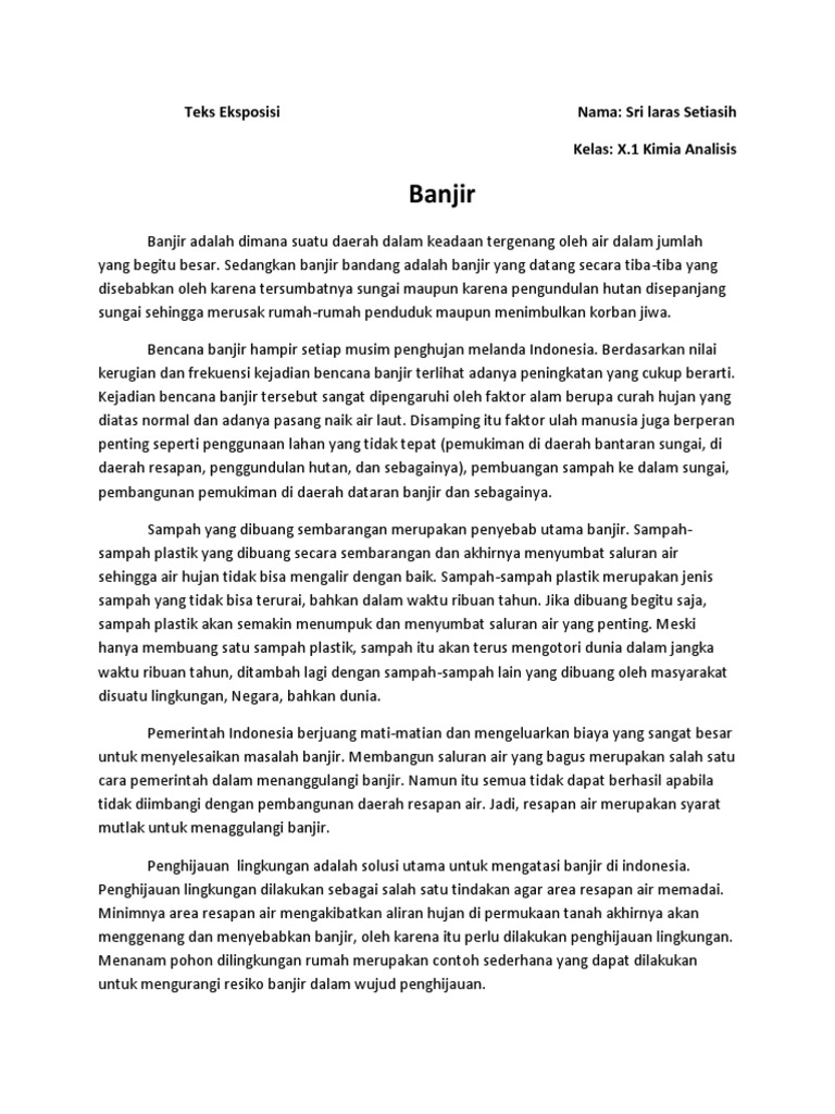 Teks eksposisi banjir. Contoh Teks Eksplanasi Setelah kita mengetahui masing-masing penjelasan mengenai berbagai teks diartikel sebelumnya. Padahal korban karena bencana banjir tentu tidak sedikit. Banjir adalah sebuah kejadian atau peristiwa alam yang sering kali terjadi di Negara kita Indonesia.